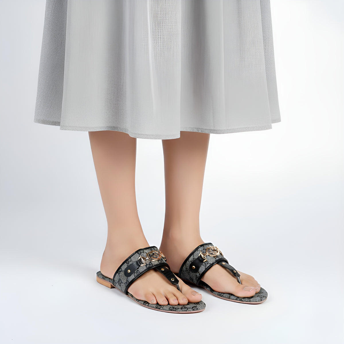 Elevate your style with these monogrammed sandals. Featuring a bold metallic emblem, premium leather straps, and a sleek monogram pattern, these sandals are perfect for making a statement while staying comfortable.